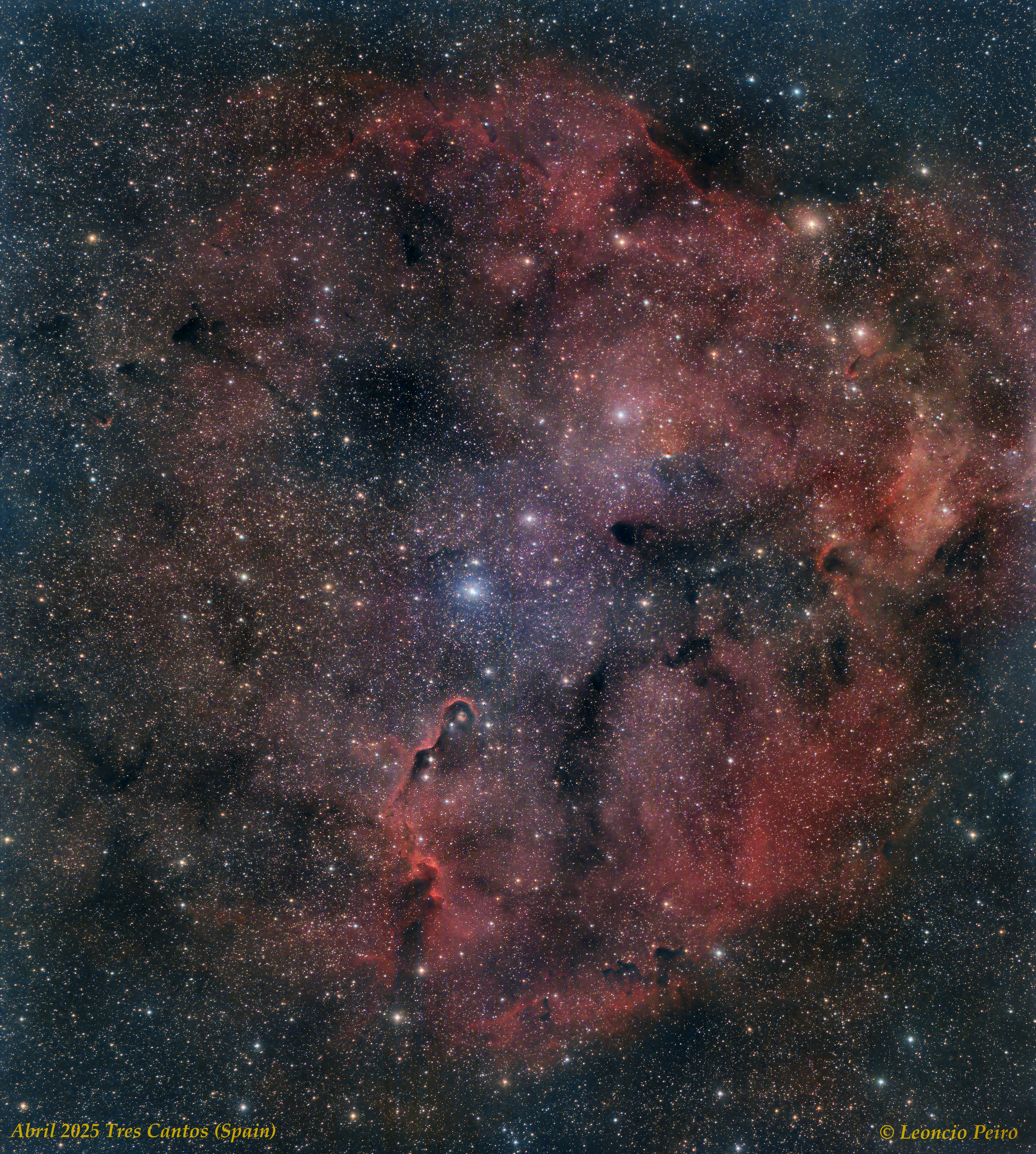 del Elefante ( IC 1396A ) está dentro de la IC 1396. Constelación.- Cefeo. Localización.- Fotos tomadas desde Tres Cantos (Madrid). Fecha.- 29 de abril de 2025. Datos de la imagen.- - C11" HD con Hyperstar a F2 560mm de focal y QHY168c con filtro Quad band de 2" de Antlia sobre EQ8-R - Mosaico de 2 teselas - Cada tesela 110 fr en RGB de 60s a -10ºC, G1 y Off10 - Bias, Darks y Flats Software y Procesado.- - Software de captura NINA. - Software de guiado: PHD2 - Software de procesado PixInsight 1.9.3 y R.C.Astro (Leo Peiró) |