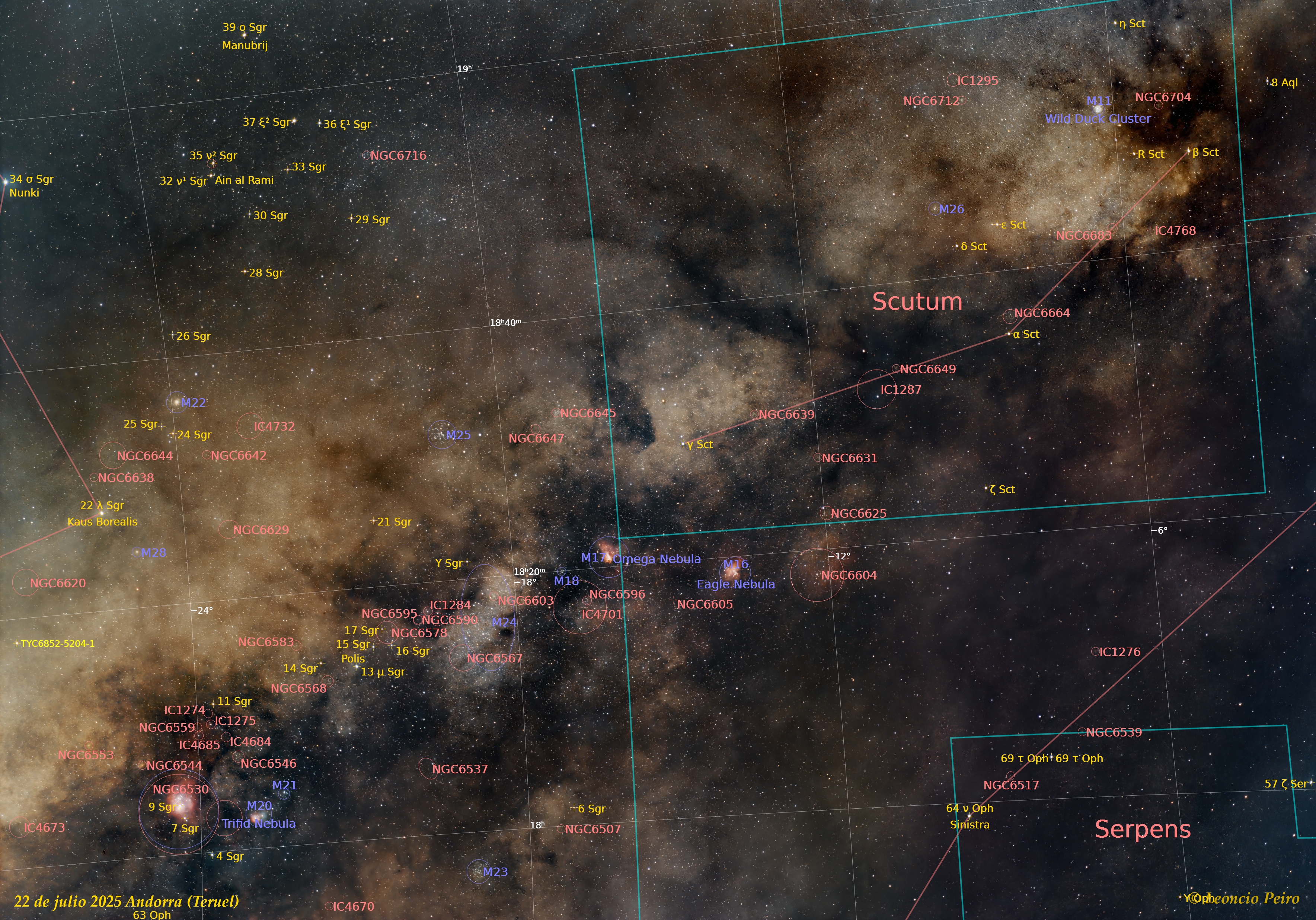 Vía Láctea anotada Fotos tomadas desde Andorra (Teruel) el 22 de septiembre de 2025. Apilado de 30 tomas de 30 s a ISO2000 y temperatura ambiente. Cámara Sony A7s con objetivo Sony-Zeiss 24-70 a 70 mm de focal sobre EQ8-R (Leo Peiró y Juan Miguel Soriano Jariod) |